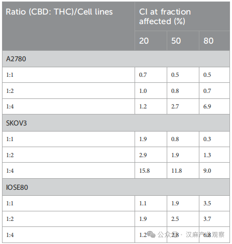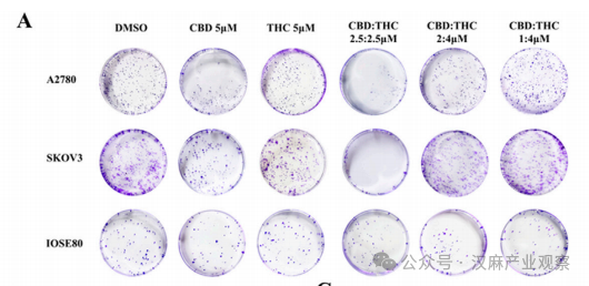 结果显示,CBD 和 THC 单独使用时已能抑制卵巢癌细胞生长,但联合使用后效果显著增强,呈现明确的 “协同效应”——1:1 等摩尔比的组合效果最佳,抑制一半癌细胞生长所需的药物浓度(IC₅₀)显著降低,且对化疗耐药的 SKOV3 细胞同样有效。